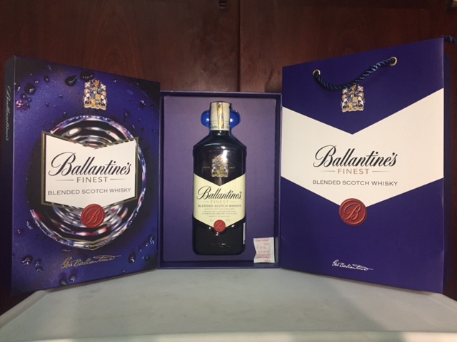 Hình ảnh đầy đủ : gồm túi, hộp và chai rượu Ballantine's Finest