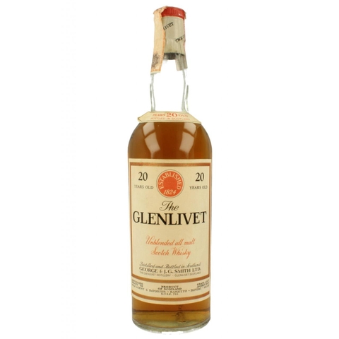 A bottle of Glenlivet's 'Unblended All-Malt' 20 year old whisky, bottled as a limited edition of 2400 bottles for the company's Italian importer Baretto. We believe this to have been released in the late 1960s, meaning the whisky would have been distilled immediately post-war in the 1940s.