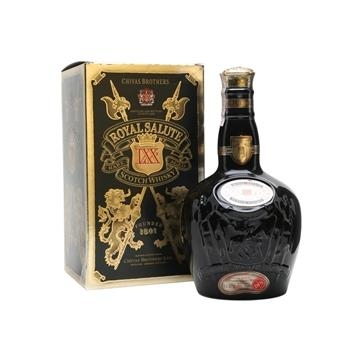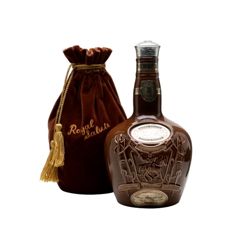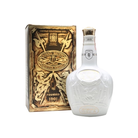 Royal Salute is the premium blend offering from Chivas and all bottlings are a minimum of 21 years of age. Originally created for Her Majesty Queen Elizabeth II in 1953, this is the old presentation of the whisky in a white Wade decanter.