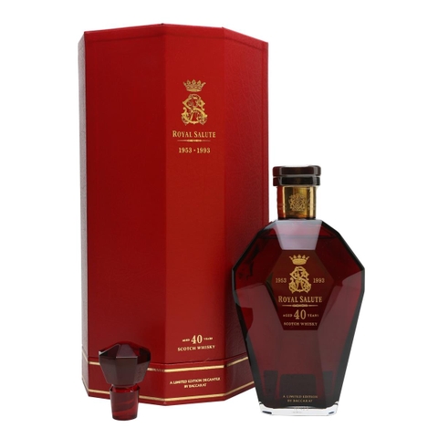 A gorgeous Baccarat ruby crystal decanter of Royal Salute, bottled at 40 years old. This was one of only 500 decanters filled to mark the 40th Anniversary of Queen Elizabeth's Coronation.