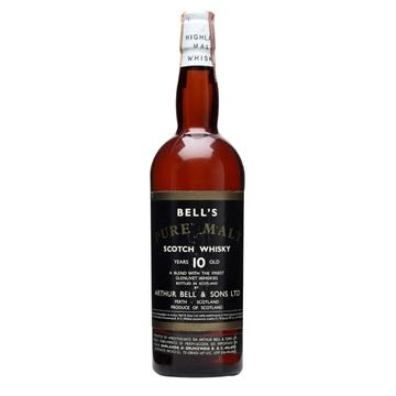 A bottle of Bell's Pure Malt whisky, presented with a rather unusual black label and released sometime in the 1970s.
