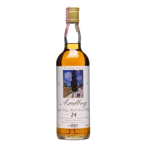 A rare bottle of 1969 Ardbeg matured in Sherry cask for 24 years. This was bottled by defunct Italian merchant Mainardi from Brescia as part of their Van Gogh collection. This bottle displays the ‘Road with Cypress and Star’ from the Dutch master.