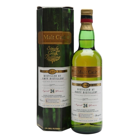 A 1977 vintage Banff, bottled by independent bottlers Douglas Laing as part of their Old Malt Cask series. Distilled in December, it was aged for 24 years before being bottled in February 2002.
