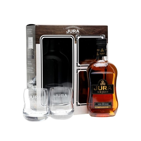 A gift pack containing two glasses and a bottle Isle of Jura Origin –an accessible, easy-drinking malt. Medium-bodied with a delicate sweet palate, with a hint of brine developing on the finish.