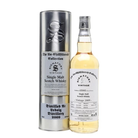 A 2009 vintage Ledaig from indie bottler Signatory as part of The Un-Chillfiltered Collection. Distilled on 6 April, it was aged in a pair of hogsheads for seven years, before being bottled on 7 September 2016. Ledaig is the name for the smoky, peaty whisky from Tobermory distillery on the Isle of Mull.