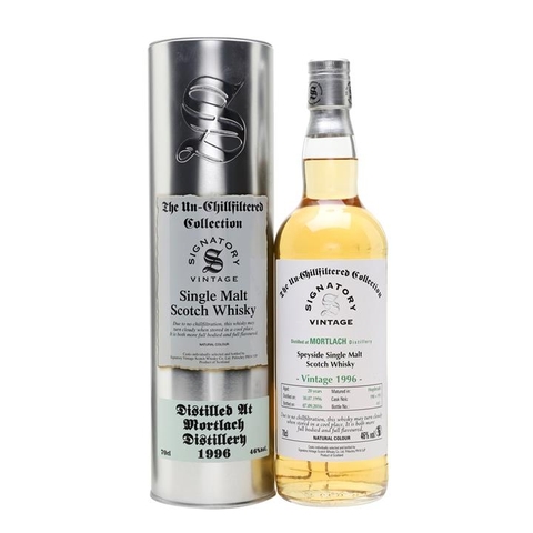 A 1996 vintage Mortlach from independent bottler Signatory as part of the Un-Chillfiltered Collection. Distilled on 30 July, it was aged in a pair of hogsheads for 20 years before being bottled on 7 September 2016.