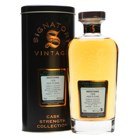 A 35-year-old whisky from Miltonduff, bottled as ' Mosstowie' to distinguish it from their regular spirit due to it being distilled using their Lomond still. It was distilled on 30 November 1979, matured in a single bourbon barrel and bottled at cask strength by Signatory on 15 May 2015.