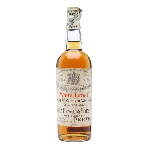 An old bottling of Dewar's White Label. Still a huge brand today, especially in the USA, it was created by John Dewar in 1846. The label bears reference to the 'Late George V', which dates the bottle in the 1940s.